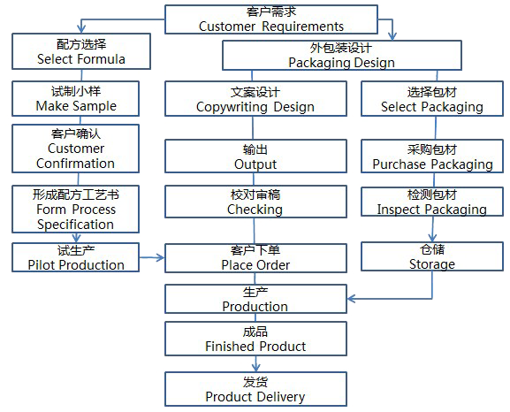 配方研發(fā)、包材原料采購(gòu)、VI設(shè)計(jì)、產(chǎn)品灌裝、產(chǎn)品送檢、三證提供的全過程。