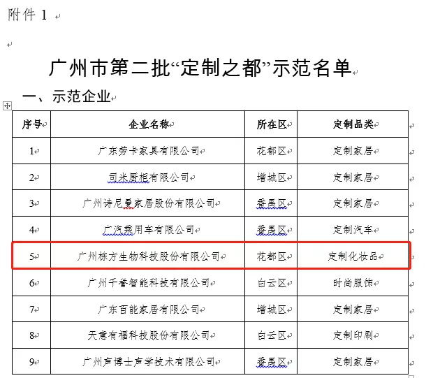 2021年10月20日,廣州市工業(yè)和信息化局官網(wǎng)公布了2021年廣州第二批“定制之都”示范單位入選名單,廣州棟方生物科技股份有限公司(簡稱:棟方股份)入選為9家“示范企業(yè)”之一,同時棟方股份成為唯一一家化妝品定制入選的企業(yè),這是對棟方股份深耕化妝品研發(fā)、樹立化妝品行業(yè)標(biāo)桿的認可。